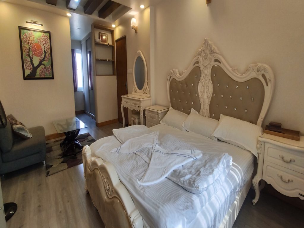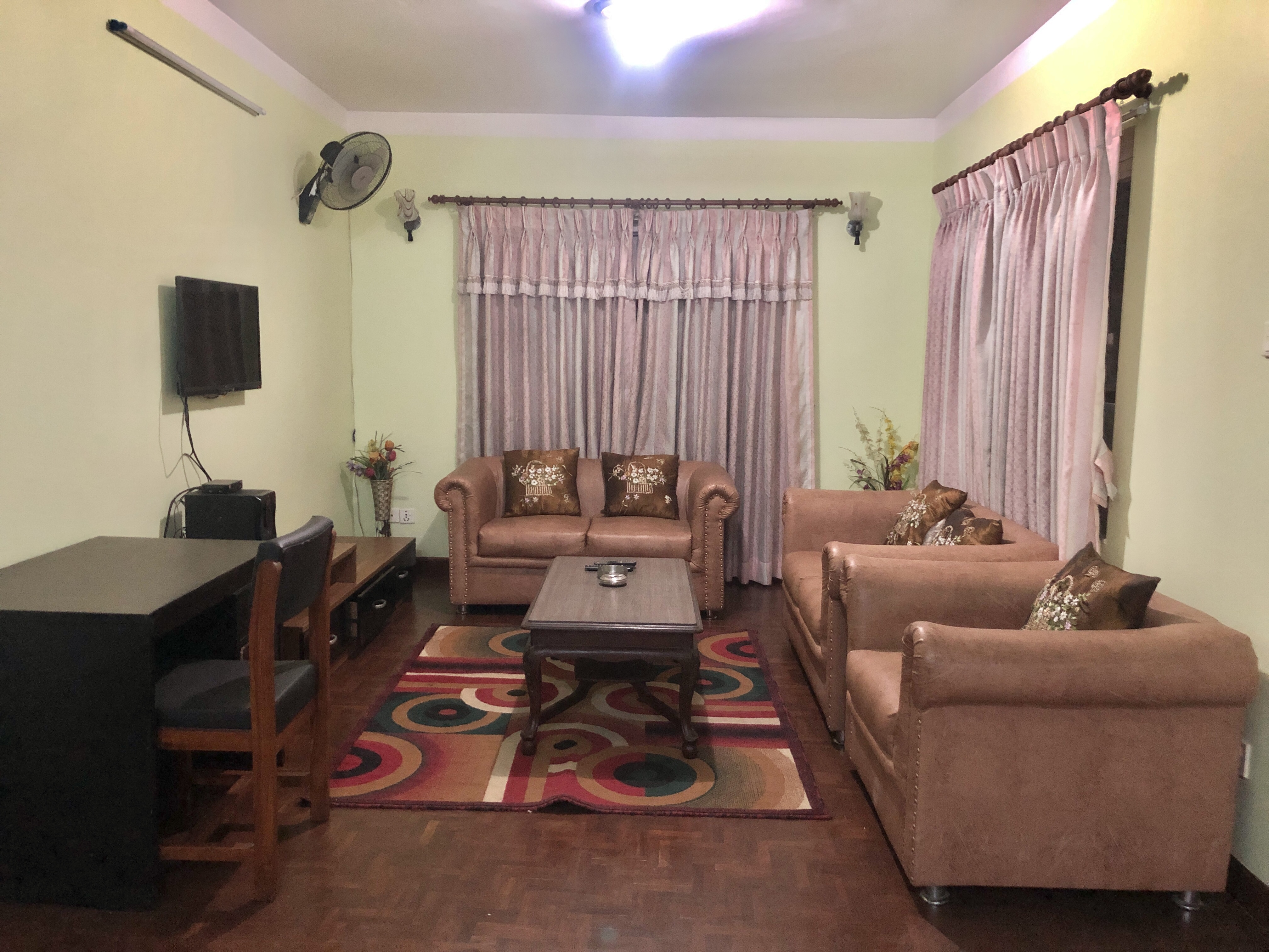 This fully furnished 2 BHK apartment is located on the 2nd floor and is perfect for a comfortable stay in Kathmandu. It features two air-conditioned bedrooms—one master bedroom with an attached bathroom and a guest bedroom with twin beds. The apartment includes a well-equipped open kitchen with kitchenware and utensils, an open living room, and a common bathroom. Enjoy modern amenities such as a Smart TV with HD channels, free Wi-Fi, solar power backup, a king-size bed in the master bedroom, and a welcoming space for family or friends.